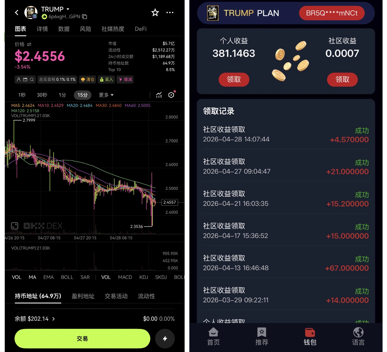 现在说一下我做的两个资金盘,为什么是资金盘还做,就是一句话,收益高,赚钱,风险也高,随时被割。第一个是特朗普币,这个是去年9月分入局的。我们是第一批入局的,当时还没有开放市场的时候,就买了节点。这个项目就是买特朗普币,质押。年化5倍,这是保证币价不变的情况下,今天我看了一下特朗普币是2.6美元/个。要是价格涨的话,就不止是5倍了。这个靠节点的收益,早已经回本,现在每天还在分币,给的都是特朗普币。