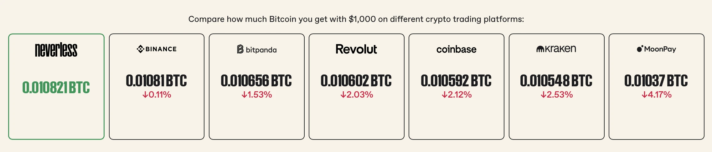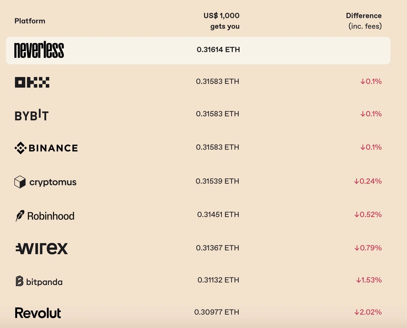 Neverless平台主打的就是一个便宜,兑换法币或者加密货币,在大部分的情况下。手续费都是0,能直接给我买省钱。