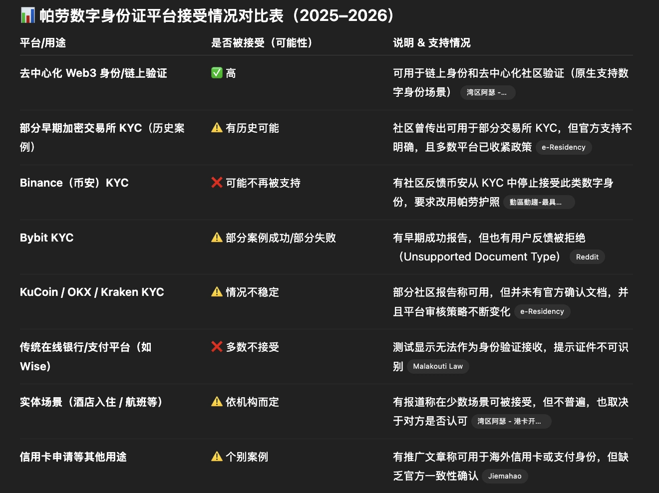 它目前主要能在链上身份验证、Web3 用途中发挥相对稳定作用,而在主流中心化交易所和正规金融服务中已经越来越难以成功用于 KYC。
