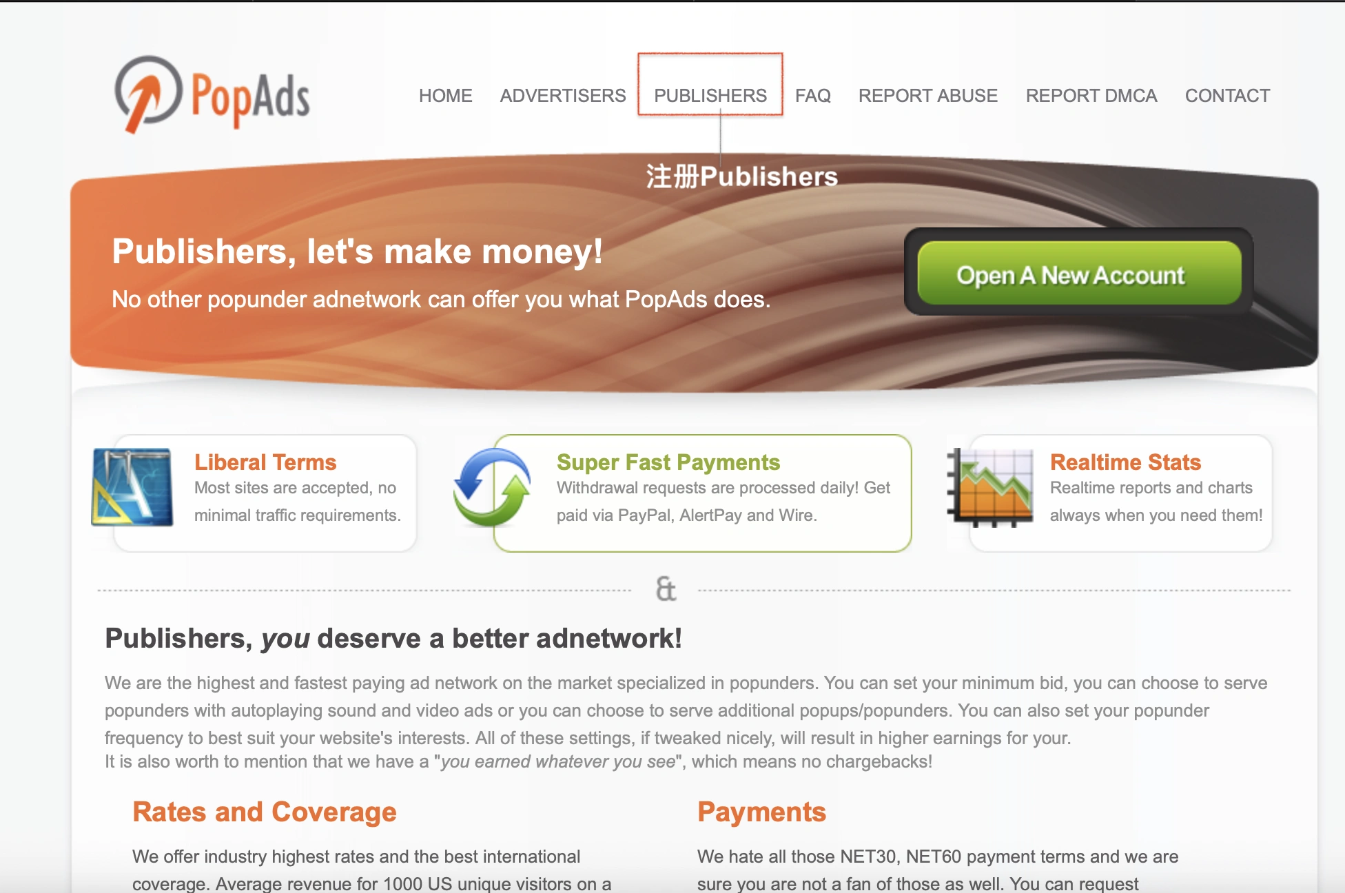 如果你有一个独立网站,而且已经有一定访问量,那 PopAds 才有意义。因为它不是帮你建站的,也不是帮你引流的,它只是帮你把已有流量变现。官方对站长的要求相对宽松,Publishers 页面写着“大多数网站都能接受,没有最低流量要求”。