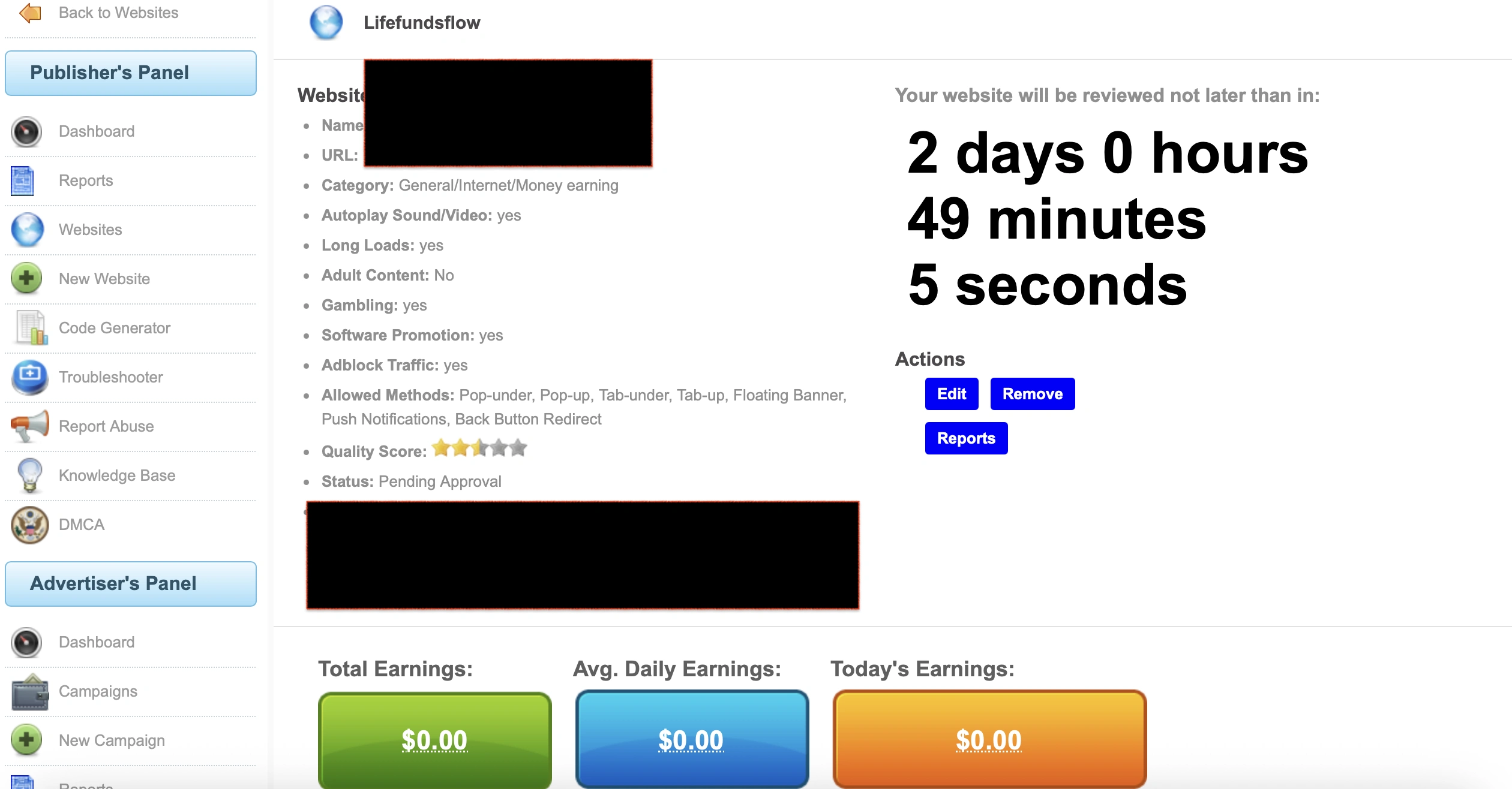 先注册 PopAds 账号,把你的网站提交审核。官方条款写得很清楚,一个账号里可以添加多个 URL,但每个 URL 都需要提交审核后才能放代码。