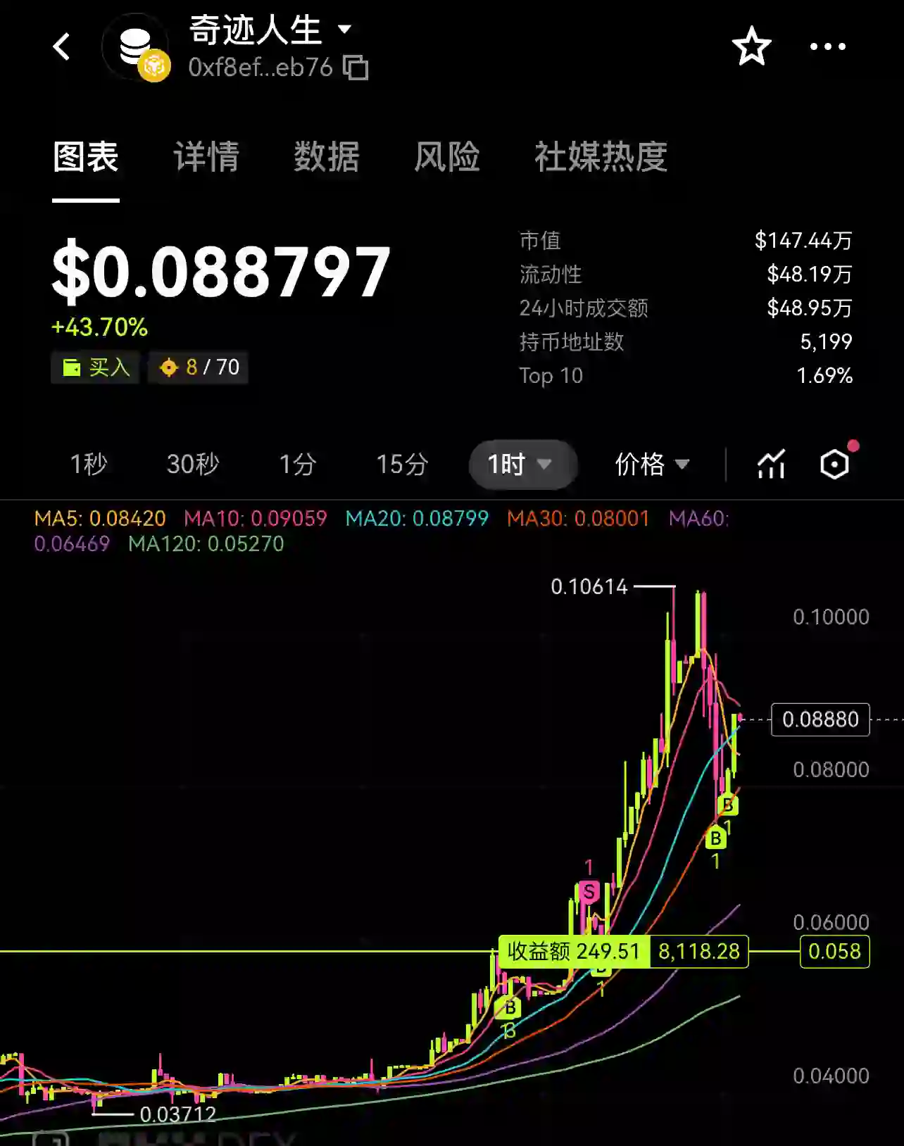 今天朋友说了一个币,叫奇迹人生(母币)。币的地址币安链0xf8ef81718c140ca6577f5a57e373c68c91ceeb76